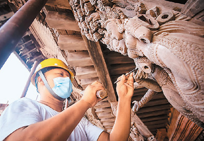 2022年,在國家文物局的指導(dǎo)下,中國文化遺產(chǎn)研究院援助尼泊爾工作隊(duì)經(jīng)過近5年努力,圓滿完成尼泊爾加德滿都杜巴廣場九層神廟建筑群文物本體維修。圖為2022年7月,工人在尼泊爾加德滿都進(jìn)行九層神廟建筑群修復(fù)工作。