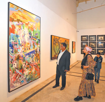 人們?cè)诎<笆锥奸_(kāi)羅參觀“藝匯絲路——中阿知名藝術(shù)家采風(fēng)作品展”。