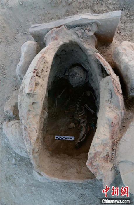 2018年貝什肯特墓地發(fā)現(xiàn)的甕棺葬。王建新 供圖