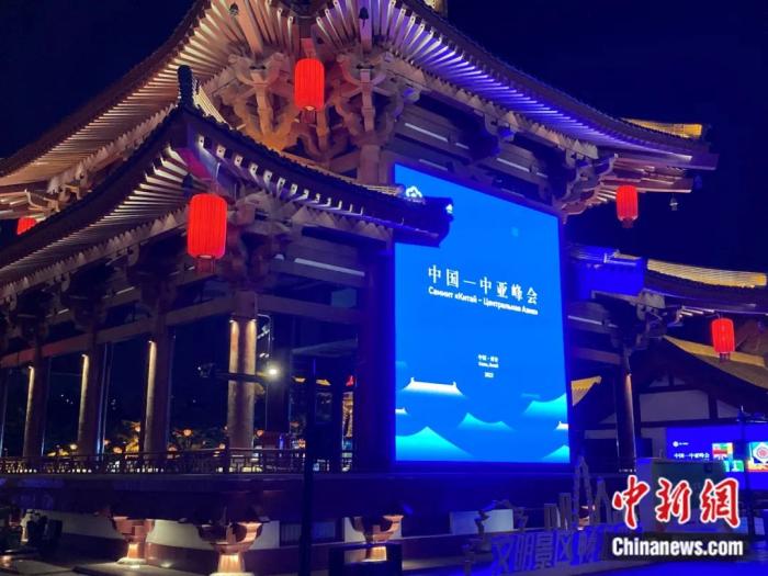2023年5月11日,西安,曲江池遺址公園夜色闌珊。中國-中亞峰會宣傳牌點(diǎn)亮,峰會即將在西安召開。李溪龍 攝
