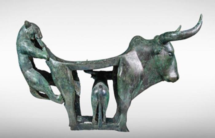 作為古滇國(guó)的一件祭器,牛虎銅案特殊的組合造型使整個(gè)銅案重心平穩(wěn),大小和諧,動(dòng)靜均衡統(tǒng)一,在力學(xué)和美學(xué)上都達(dá)到了極高水平,是云南青銅文化藝術(shù)的杰作。