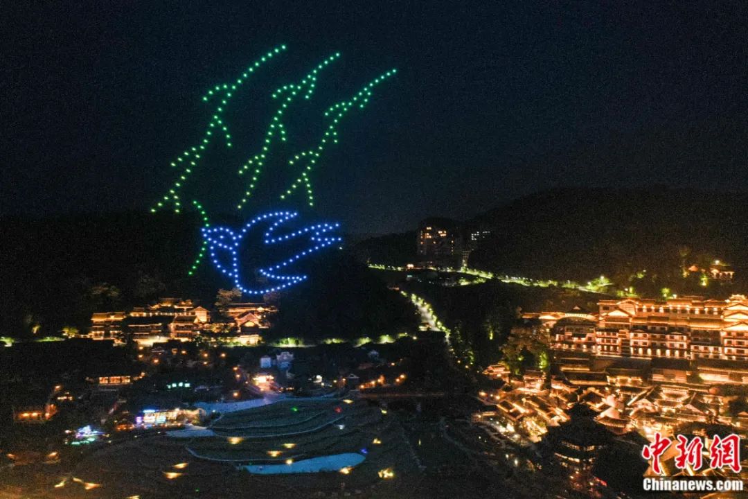 2022年6月,貴州省遵義市播州區(qū)烏江寨景區(qū)進(jìn)行無人機(jī)編隊(duì)表演。(無人機(jī)照片)瞿宏倫 攝