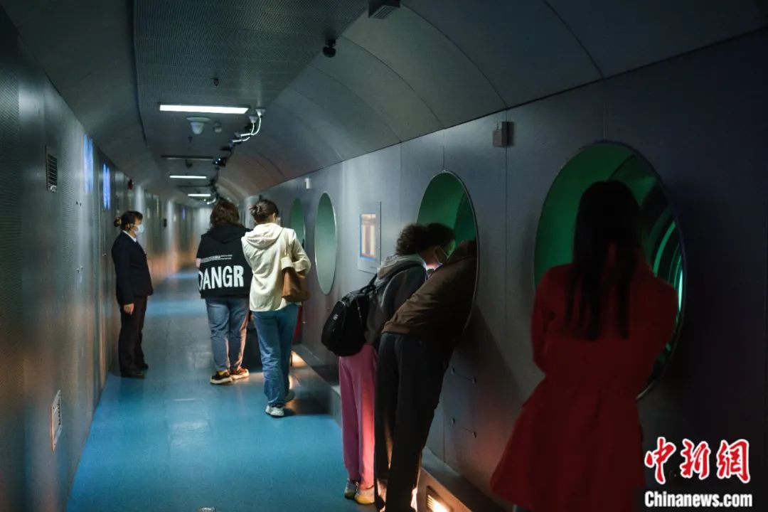 游客在白鶴梁水下博物館通過觀測窗口觀賞水下題刻。何蓬磊 攝