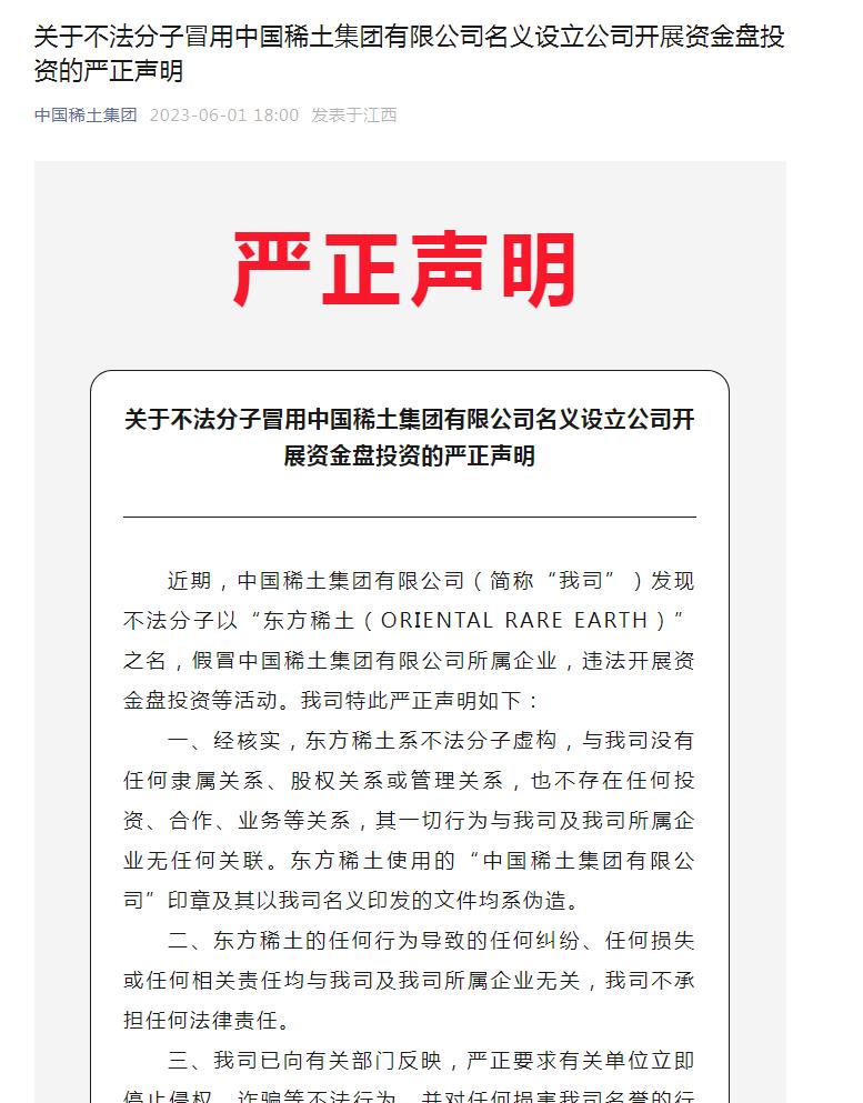 “中國稀土集團(tuán)”微信公眾號(hào)曾在6月1日發(fā)布嚴(yán)正聲明提醒,近期,中國稀土集團(tuán)有限公司(下稱“中國稀土”)發(fā)現(xiàn)不法分子以“東方稀土(ORIENTAL RARE EARTH)”之名,假冒中國稀土集團(tuán)有限公司所屬企業(yè),違法開展資金盤投資等活動(dòng)。