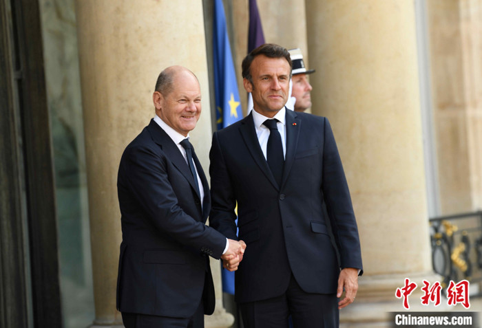 當(dāng)?shù)貢r(shí)間6月12日晚,法國(guó)總統(tǒng)馬克龍?jiān)诎屠钀?ài)麗舍宮會(huì)見(jiàn)德國(guó)總理朔爾茨。朔爾茨前來(lái)出席當(dāng)天舉行的法德波三國(guó)領(lǐng)導(dǎo)人會(huì)談。 中新社記者 李洋 攝
