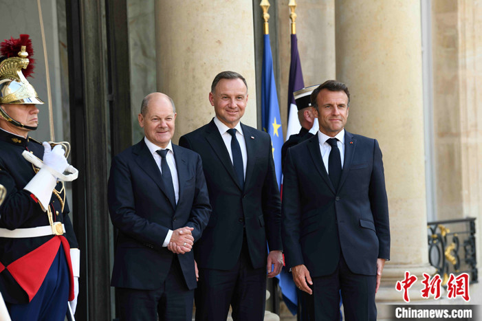當(dāng)?shù)貢r(shí)間6月12日晚,法國(guó)總統(tǒng)馬克龍?jiān)诎屠钀?ài)麗舍宮與德國(guó)總理朔爾茨、波蘭總統(tǒng)杜達(dá)會(huì)面。他們共同出席“魏瑪三角”機(jī)制下的三國(guó)領(lǐng)導(dǎo)人會(huì)議。 中新社記者 李洋 攝