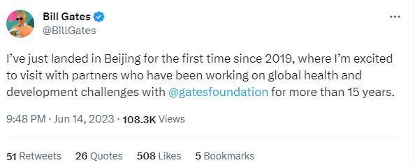 中新網6月14日電 北京時間14日,比爾及梅琳達·蓋茨基金會聯(lián)席主席兼理事、美國微軟公司聯(lián)合創(chuàng)始人比爾·蓋茨在社交媒體上發(fā)文稱已抵達北京。
