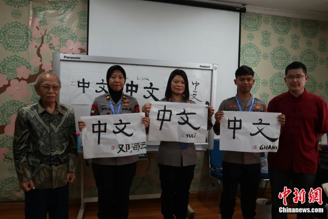 2023年3月,印尼阿拉扎大學(xué)孔子學(xué)院為印尼國(guó)家警察語(yǔ)言學(xué)院的警員們開(kāi)展系列中國(guó)文化活動(dòng)。如今越來(lái)越多的印尼公職人員開(kāi)始學(xué)習(xí)中文。圖為印尼警察展示中國(guó)書(shū)法作品。李志全 攝