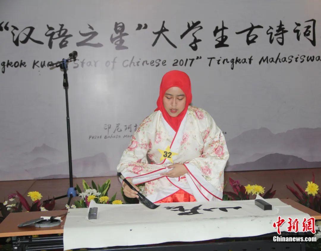 由中國(guó)孔子學(xué)院總部/國(guó)家漢辦主辦、印尼阿拉扎大學(xué)孔子學(xué)院承辦的2017“漢語(yǔ)之星”大學(xué)生古詩(shī)詞大賽在雅加達(dá)舉行。圖為印尼選手表演中國(guó)書(shū)法。林永傳 攝