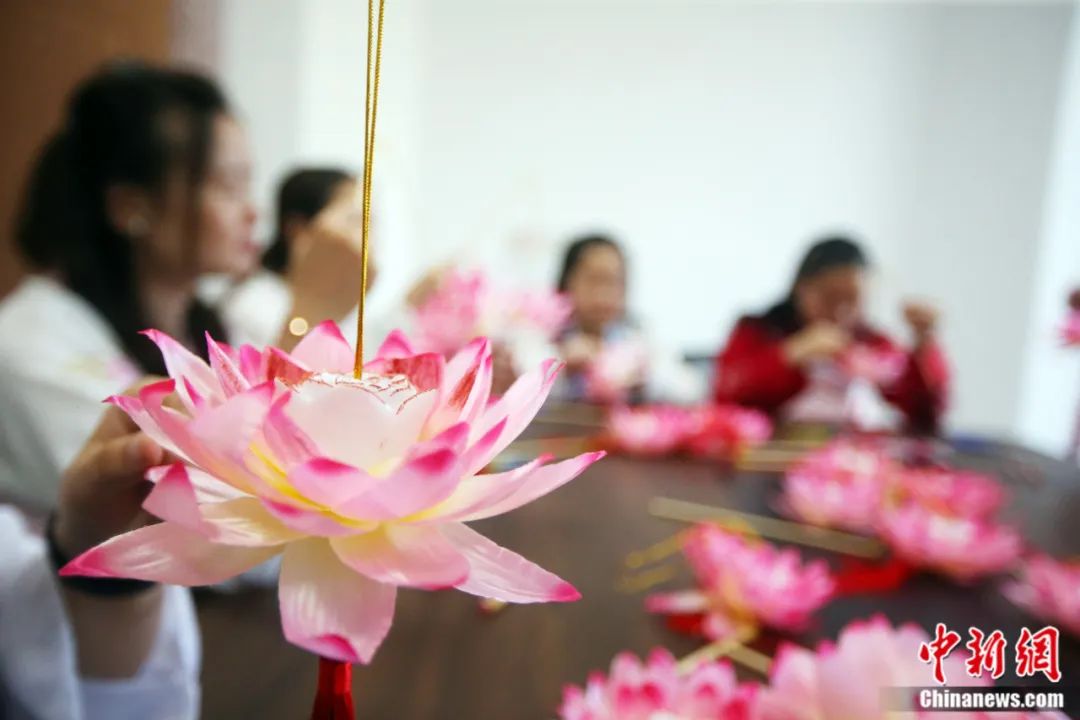 江蘇省南通市崇川區(qū)陳橋街道五里樹(shù)社區(qū)居民制作荷花燈。徐培欽 攝