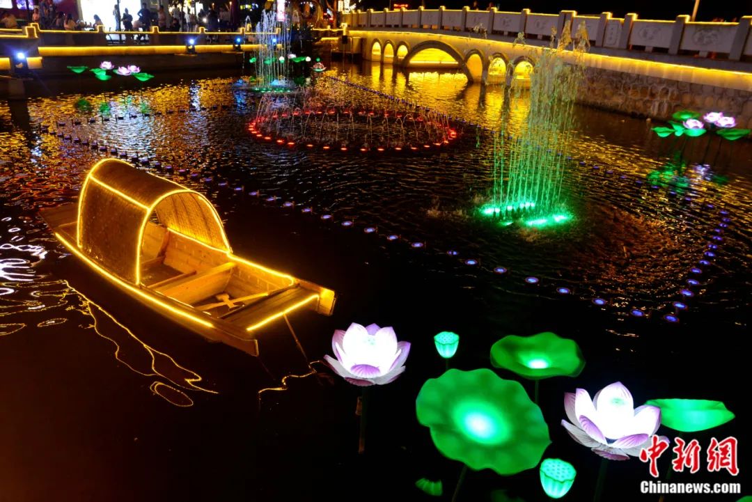 江蘇省張家港市, 夜色下,點(diǎn)亮池塘的“荷花”、噴泉、船兒與美麗水波紋,吸引市民與游客駐足欣賞。楊木軍 攝
