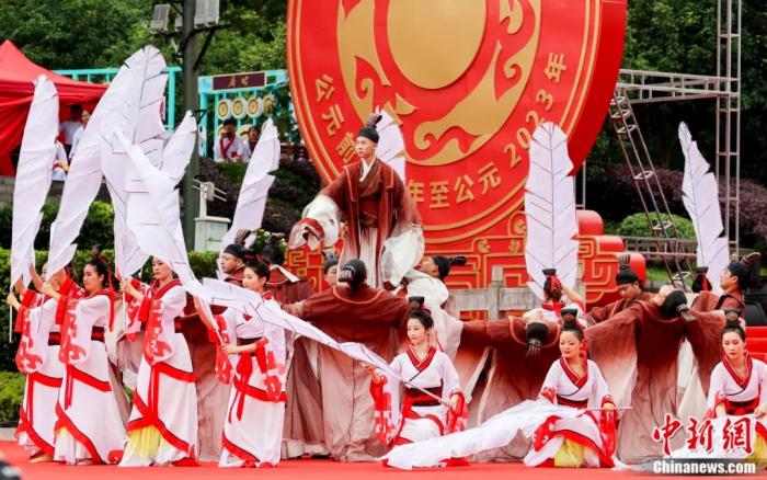 2023年6月21日,“中國(guó)端午 詩(shī)意宜昌”2023屈原故里端午文化節(jié)在湖北省宜昌市秭歸縣屈原故里文化旅游區(qū)盛大開(kāi)幕。圖為開(kāi)幕式上文藝表演舞蹈《屈原》。張暢 攝