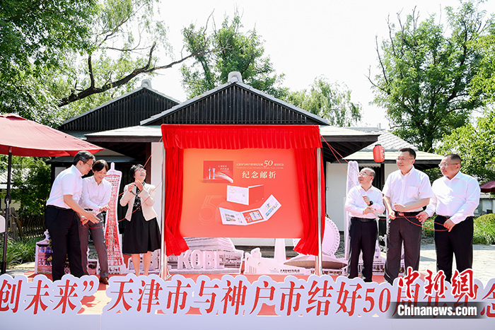 6月24日,中日嘉賓為《天津市與神戶(hù)市締結(jié)友城50周年紀(jì)念郵折》揭幕。當(dāng)日,主題為“接續(xù)友好 共創(chuàng)未來(lái)”天津市與神戶(hù)市結(jié)好50周年紀(jì)念活動(dòng)在天津水上公園神戶(hù)園舉行。 中新社記者 佟郁 攝