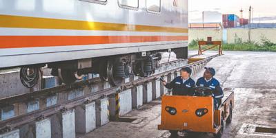 中國(guó)師父毛鑫(右)與學(xué)員彼得·恩堅(jiān)加在內(nèi)羅畢站區(qū)運(yùn)轉(zhuǎn)車間內(nèi)調(diào)度車輛。