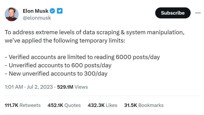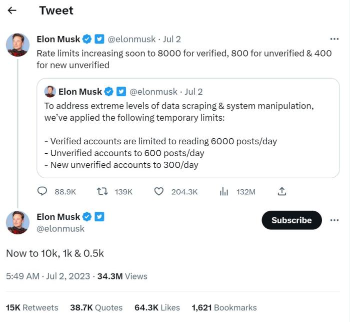 對此,馬斯克很快做出了反應。在宣布最初限制后僅幾小時,他又發(fā)文稱,將限制提高到了已驗證賬戶8000條、未驗證賬戶800條、新的未驗證賬戶400條,并在當天再次將限制瀏覽量分別提高到了10000條、1000條和500條。
