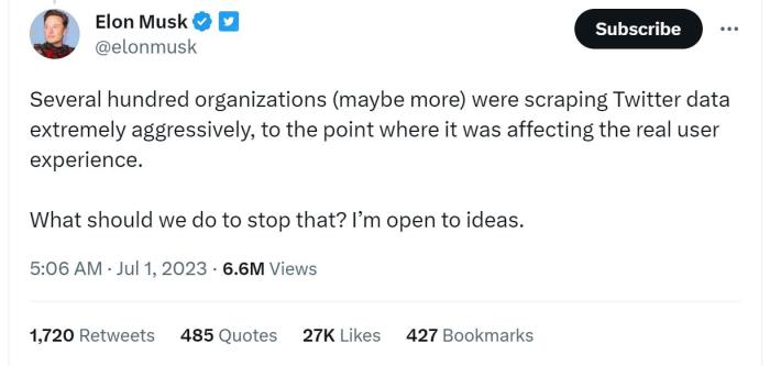他還發(fā)布推文稱,數百個甚至更多的組織正在“極其積極地”抓取推特數據,“這影響了真正的用戶體驗”,但馬斯克尚未說明限制會持續(xù)多久,也并未表示在什么條件下將取消限制。