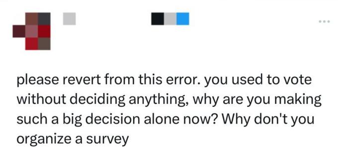 有網友呼吁,“請改正這個錯誤。你以前在投票時都不做出任何決定,為什么現在要獨自做出這么大的決定?你為什么不組織一次調查?!?/p>