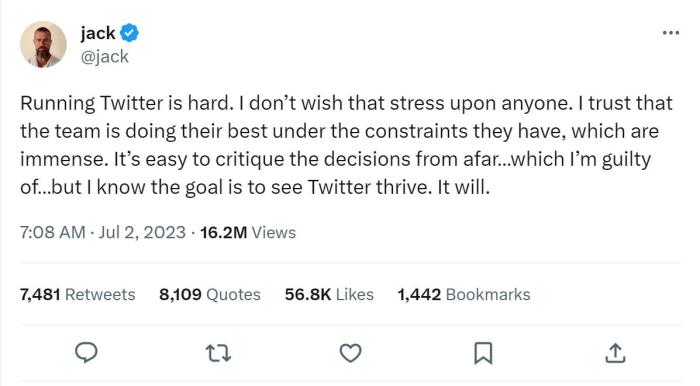 推特聯合創(chuàng)始人、前首席執(zhí)行官杰克·多爾西隨后發(fā)表了對此事的看法,他表示,“運營推特是很困難的。我不希望任何人受到這種壓力。我相信這個團隊在巨大的限制條件下,正在盡最大努力。從遠處批評這些決定是很容易的……我也對此感到歉疚……但我知道他們的目標是要看到推特的繁榮。它會的?!?/p>