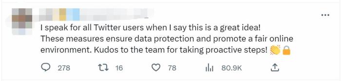 但也有網友對此表示歡迎,表示“我代表所有的推特用戶聲明,這是一個好主意!這些措施能確保數據得到保護,同時促進公平的網絡環(huán)境。感謝團隊采取積極措施。”