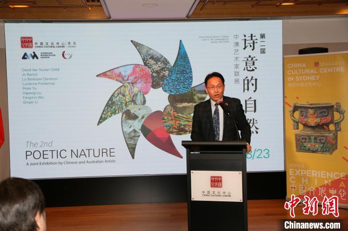 當(dāng)?shù)貢r(shí)間7月6日晚,第二屆“詩意的自然—中澳藝術(shù)家聯(lián)展”在悉尼開幕。圖為悉尼中國文化中心主任兼中國駐悉尼旅游辦事處主任肖夏勇在開幕式上致辭。中新社記者 顧時(shí)宏 攝