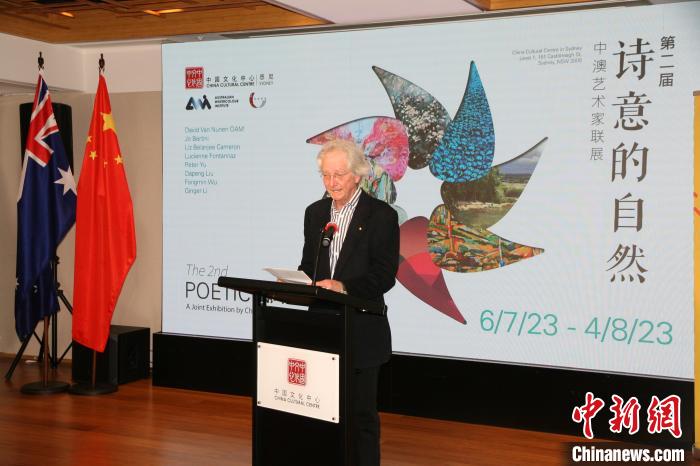當(dāng)?shù)貢r(shí)間7月6日晚,第二屆“詩意的自然—中澳藝術(shù)家聯(lián)展”在悉尼開幕。圖為澳大利亞水彩畫協(xié)會(huì)主席大衛(wèi)·范·紐恩在開幕式上致辭。中新社記者 顧時(shí)宏 攝