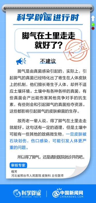 老一輩人說,得了腳氣在土里走走就能好。這句話有一定的道理,但是土壤中可能有一些其他的致病微生物,一旦皮膚被石塊劃傷,傷口感染,可能引發(fā)人體更嚴重的問題。所以得了腳氣,還是請到醫(yī)院就診開藥吧。(來源:科學辟謠、中國新聞網(wǎng)微博)