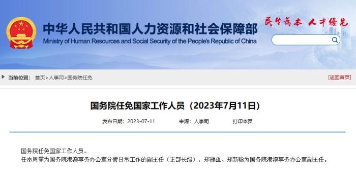 任命周霽為國務院港澳事務辦公室分管日常工作的副主任(正部長級),鄭雁雄、鄭新聰為國務院港澳事務辦公室副主任。