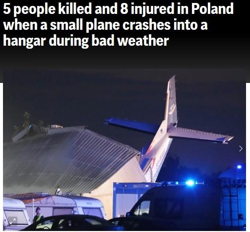 據(jù)報(bào)道,當(dāng)天,波蘭國(guó)家消防局發(fā)言人莫妮卡·諾瓦科斯卡·布林達(dá)(Monika Nowakowska-Brynda)表示,“波蘭中部的克辛諾(Chrcynno)地區(qū),受惡劣天氣影響,一架塞斯納型飛機(jī)在降落時(shí)墜入跳傘中心的機(jī)庫(kù),事發(fā)時(shí)有10人在機(jī)庫(kù)中,飛行員和在機(jī)庫(kù)中躲避暴風(fēng)雨天氣的4名人員遇難?!?/p>
