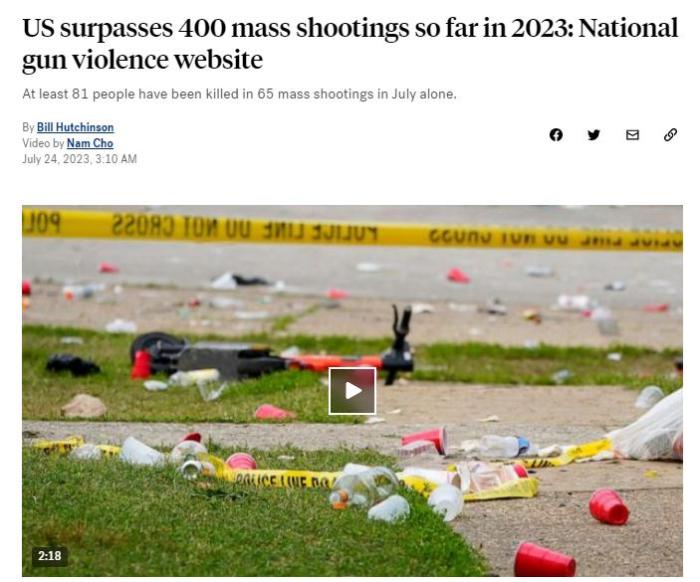 中新網(wǎng)7月24日電 據(jù)美國廣播公司(ABC)24日?qǐng)?bào)道,美國“槍支暴力檔案”的數(shù)據(jù)顯示,在2023年,美國已發(fā)生超過400起大規(guī)模槍擊事件。該網(wǎng)站將大規(guī)模槍擊事件定義為造成4人或4人以上傷亡的單一事件。