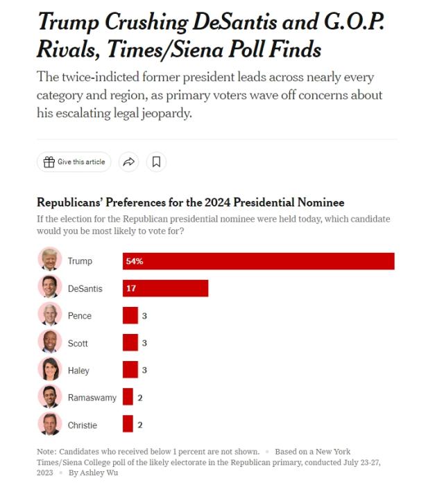 中新網(wǎng)7月31日電 據(jù)《紐約時(shí)報(bào)》報(bào)道,《紐約時(shí)報(bào)》和錫耶納學(xué)院31日公布了一項(xiàng)針對(duì)共和黨選民的聯(lián)合民意調(diào)查結(jié)果:在所有的共和黨總統(tǒng)競(jìng)選人中,特朗普以54%的支持率取得絕對(duì)領(lǐng)先地位,超出第二位德桑蒂斯37%,其余候選人支持率均未超過3%。