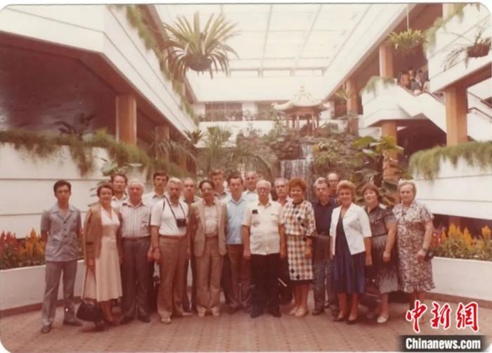 1983年10月,應中國人民對外友好協會和中蘇友好協會邀請,時任蘇中友好協會主席謝爾蓋·列昂尼多維奇·齊赫文斯基率代表團前往中國。圖為代表團成員在廣州白天鵝賓館合影。圖片來源:庫利科娃個人搜集的檔案資料