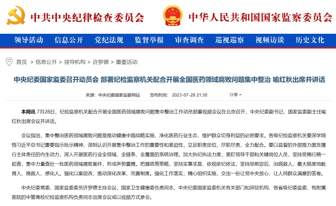 7月21日,國(guó)家衛(wèi)生健康委會(huì)同教育部、公安部、審計(jì)署、國(guó)務(wù)院國(guó)資委、市場(chǎng)監(jiān)管總局、國(guó)家醫(yī)保局、國(guó)家中醫(yī)藥局、國(guó)家疾控局、國(guó)家藥監(jiān)局,十個(gè)部門(mén)聯(lián)合召開(kāi)視頻會(huì)議,部署開(kāi)展為期1年的全國(guó)醫(yī)藥領(lǐng)域腐敗問(wèn)題集中整治工作。