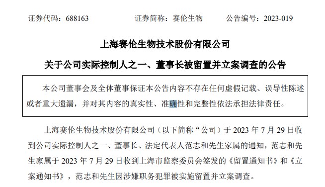 公告稱,賽倫生物實(shí)際控制人之一、董事長(zhǎng)、法定代表人范志和于2023年7月29日收到上海市監(jiān)察委員會(huì)簽發(fā)的《留置通知書(shū)》和《立案通知書(shū)》,范志和因涉嫌職務(wù)犯罪被實(shí)施留置并立案調(diào)查。