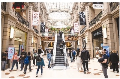 人們?cè)诎⒏⑹锥疾家酥Z斯艾利斯佛羅里達(dá)大街上的一座購(gòu)物中心內(nèi)游覽。