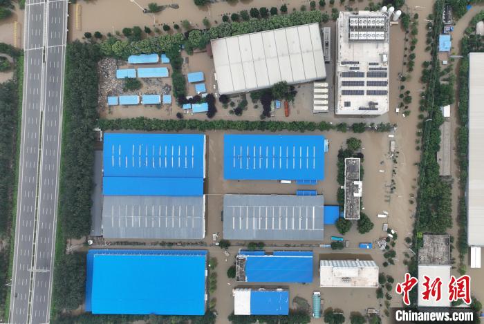 8月5日,中圖網(wǎng)倉儲中心所在區(qū)域依然有大量積水。(無人機照片)中新社記者 韓冰 攝
