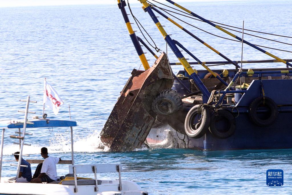 8月3日,在埃及胡爾加達(dá)附近水域,一輛廢棄的裝甲車被沉入海底特定區(qū)域。