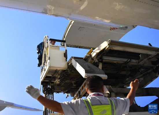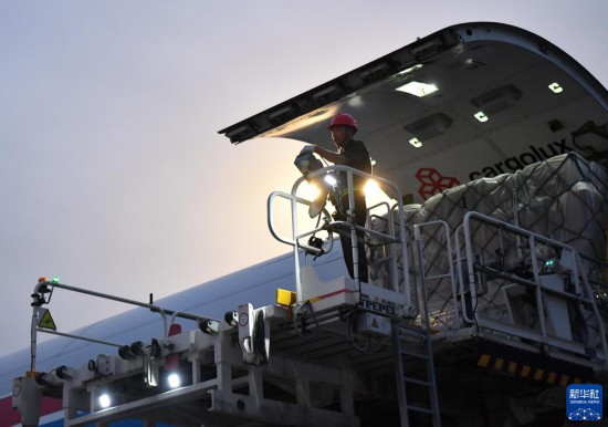 8月1日,工作人員在中國(guó)鄭州新鄭國(guó)際機(jī)場(chǎng)為一架盧森堡貨航貨機(jī)裝貨。新華社記者 李嘉南 攝