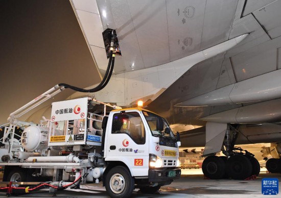 8月1日,在中國(guó)鄭州新鄭國(guó)際機(jī)場(chǎng),中國(guó)航油華南藍(lán)天河南分公司的工作人員為一架盧森堡貨航貨機(jī)加油。新華社記者 李嘉南 攝