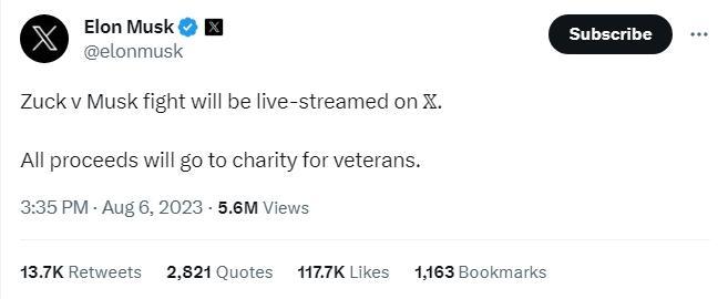 當(dāng)?shù)貢r(shí)間6日,馬斯克在“X”平臺上發(fā)文稱,要將兩人約架過程在“X”平臺直播,并把相關(guān)收益全部捐贈給服務(wù)退伍老兵的慈善機(jī)構(gòu),同時(shí)表示自己正在為決斗“夜以繼日”地訓(xùn)練。