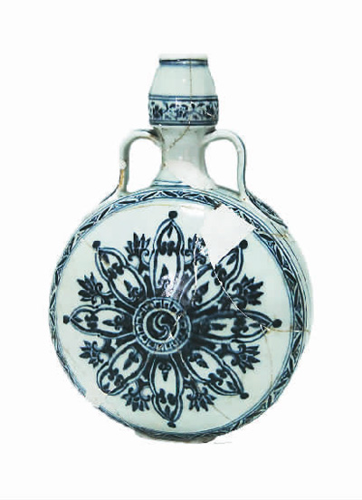 明永樂(lè)青花伊斯蘭花紋雙耳扁壺。