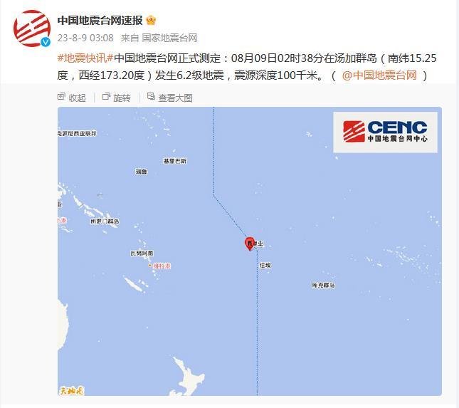 中國地震臺網正式測定:08月09日02時38分在湯加群島(南緯15.25度,西經173.20度)發(fā)生6.2級地震,震源深度100千米。(國家地震臺網官方微博)