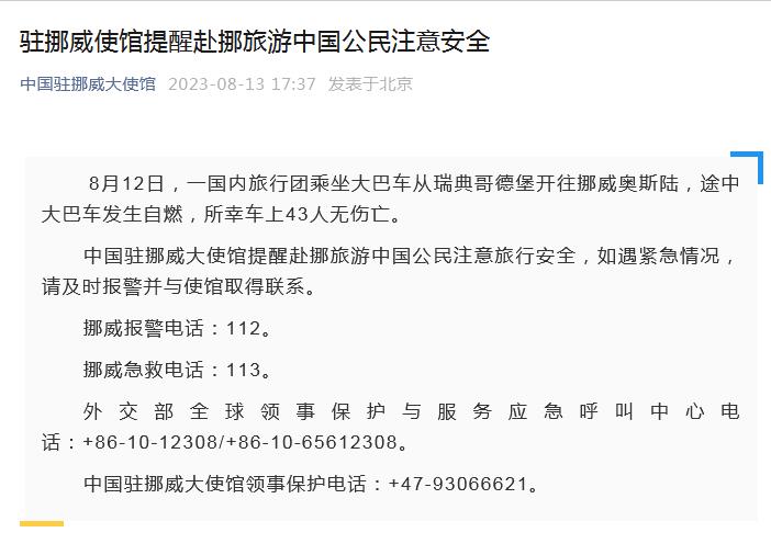 中新網(wǎng)8月13日電 據(jù)中國(guó)駐挪威大使館微信公眾號(hào)消息,8月12日,一國(guó)內(nèi)旅行團(tuán)乘坐大巴車從瑞典哥德堡開往挪威奧斯陸,途中大巴車發(fā)生自燃,所幸車上43人無(wú)傷亡。