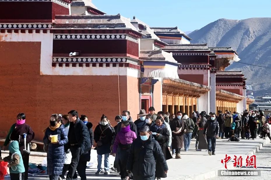 2023年2月5日被譽(yù)為“世界藏學(xué)府”的拉卜楞寺迎來一年中最熱鬧的“朝佛季”,眾多藏傳佛教信眾及游客前來轉(zhuǎn)經(jīng)、禮佛、朝拜。圖為信眾及游客前往朝佛途中。中新社記者 九美旦增 攝