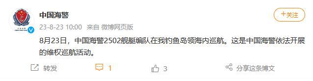 中新網(wǎng)8月23日電 據(jù)中國(guó)海警局官方微博消息,8月23日,中國(guó)海警2502艦艇編隊(duì)在中國(guó)釣魚(yú)島領(lǐng)海內(nèi)巡航。這是中國(guó)海警依法開(kāi)展的維權(quán)巡航活動(dòng)。