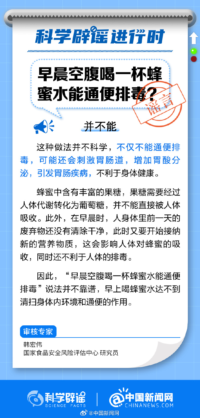 中新網(wǎng)8月22日電 早晨空腹喝蜂蜜水不僅不能通便排毒,可能還會(huì)刺激胃腸道,增加胃酸分泌,引發(fā)胃腸疾病。蜂蜜中含有豐富的果糖,果糖需要經(jīng)過人體代謝轉(zhuǎn)化為葡萄糖,并不能直接被人體吸收。在早晨,人身體里前一天的廢棄物還沒有清除干凈,此時(shí)又要開始接納新的營(yíng)養(yǎng)物質(zhì),這會(huì)影響人體對(duì)蜂蜜的吸收,還不利于人體的排毒。(來源:@科學(xué)辟謠 @中國(guó)新聞網(wǎng) )