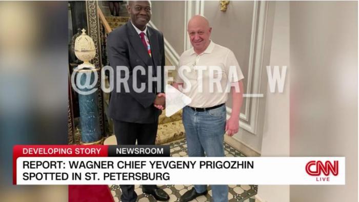 在圣彼得堡舉行的俄非峰會期間,“瓦格納”組織創(chuàng)始人普里戈任被拍到和與會非洲代表握手。(圖片來源:美國有線電視新聞網(wǎng)視頻截圖)