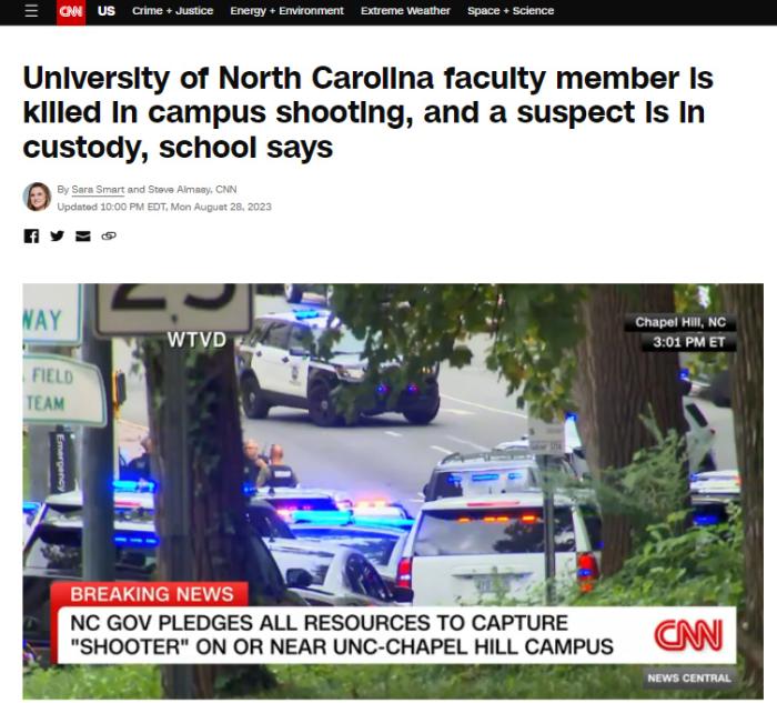 中新網(wǎng)8月29日電 綜合美媒報(bào)道,當(dāng)?shù)貢r間28日,美國北卡羅來納大學(xué)教堂山分校發(fā)生一起槍擊事件,造成該校一名教職人員死亡。