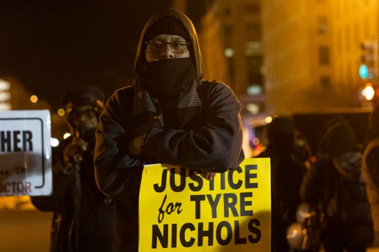 1月27日,在美國首都華盛頓,人們?cè)诎讓m前抗議非洲裔男子泰爾·尼科爾斯遭警察毆打身亡。新華社發(fā)(亞倫攝)