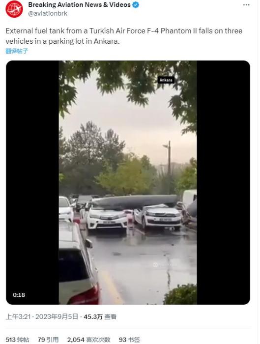 中新網(wǎng)9月6日電 綜合外媒報(bào)道,當(dāng)?shù)貢r(shí)間9月4日,土耳其空軍一架戰(zhàn)斗機(jī)在飛行途中油箱突然掉落,砸中安卡拉市一露天停車場的汽車,所幸未造成人員傷亡。