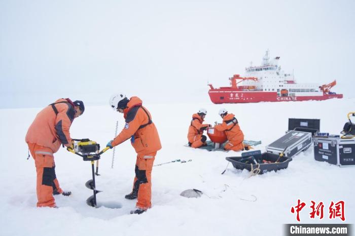 近日,中國(guó)第13次北冰洋科學(xué)考察隊(duì)在北極點(diǎn)附近開展海冰綜合作業(yè)。(自然資源部供圖)